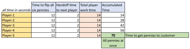 Now, let’s analyze how long all of this took. For the sake of simplicity, I will assume it takes on average about 2 seconds to flip each penny, so 12 seconds total to flip all six, then 2 seconds to push the pennies to the next player, and ultimately to the customer. This means that each worker (player) works for 14 seconds, and the customer receives all the pennies at 70 seconds, as shown below: